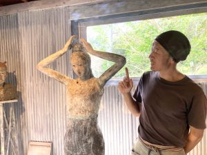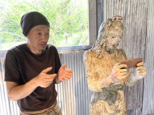 「道沿いに川がありますけど、ここの川岸にも作品を置きますよ。」