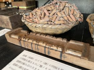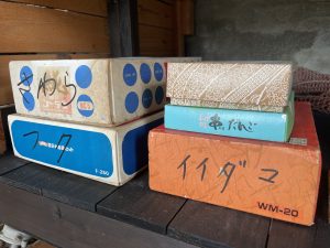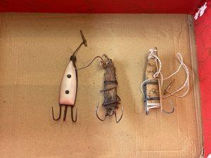 懐かしい箱に入った小さな道具たち。中にはお祖父さんが釣りや漁で使っていた仕掛けが入っていました。1個だけプラスチック製の仕掛けが。それ以外は手作りしたであろう、竹と糸で作った仕掛けばかり。プラスチックの仕掛けを見本に、寄せて作っていることがよくわかる造形物です。
