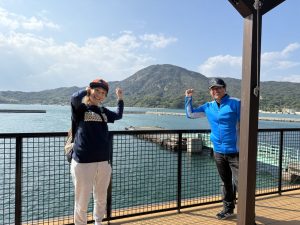 江の浦港待合所の展望デッキに戻ってきて、王頭山に行ってきたぞー!写真。