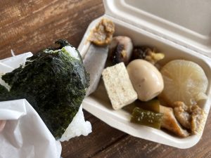 (写真/NPO法人 男木島生活研究所の福井さんお手製、男木みそピーナッツおむすびとサザエ男木みそでいただくおでん)