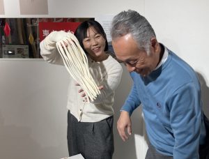 「大阪関西万博の香川県催事で、実際に展示したものです。デザイナーから「手袋でうどんを作ってください」という無茶振りオファー(?)がきたのが今年1月頃。そこから、東かがわ市の手袋職人が急ピッチで考案し、試作を重ねて、5月に展示しました」