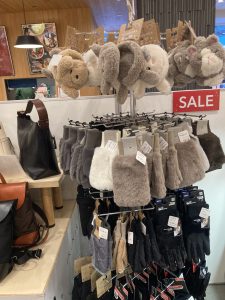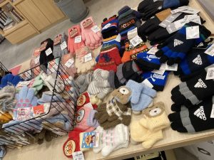 讃岐おもちゃ美術館の入口ショップスペースには、たくさんの手袋やカバンなど。