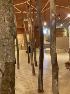木のぬくもりあふれる館内。中央部にはさまざまな種類の「木」が立っています。