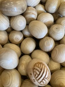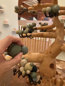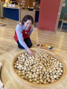 小さな池には木の玉がたくさん!中に入って遊べます。木の香りもしますよ。