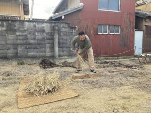 材料の藁は無農薬のものを県内外から探して集め、むしろの編み方を習いに長野県まで足を運んだのだそうです。